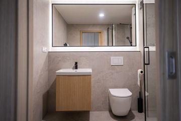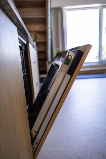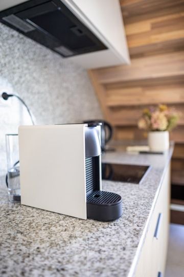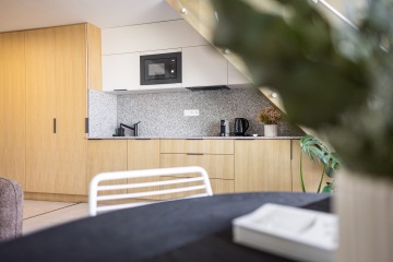 V každém apartmánu na vás čeká plně vybavená kuchyň, kde si snadno připravíte snídani, oběd i večeři. Součástí jsou moderní spotřebiče – sklokeramická deska, mikrovlnná trouba, lednice – a kompletní sada nádobí a kuchyňských doplňků, abyste měli vše, co potřebujete pro pohodlný pobyt. Každý apartmán má samozřejmě také vlastní koupelnu se sprchovým koutem.