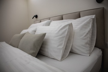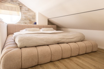 Každá ložnice nabízí luxusní manželskou postel nadstandardní velikosti, která zve k odpočinku. Vaše oblečení i osobní věci pohodlně uložíte do prostorných vestavěných šatních skříní, aby vám v apartmánu nic nechybělo. Spodní apartmány mají ložnici oddělnou. Vrchní apartmány jsou mezonetové s otevřenou ložnicí.